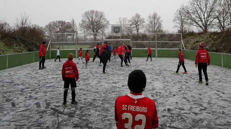 Die E-Jugend rief stattdessen auf, sich morgens um 10 Uhr auf dem Mehrgenerationenplatz an der frischen Luft zu treffen, um dort gemeinsam mit den Eltern ein bisschen zu bolzen. Diesem Aufruf folgten auch insgesamt 8 Familien.